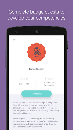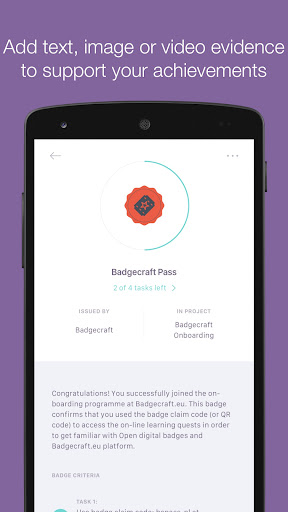 Badge Wallet adalah cara yang mudah dan selamat untuk mendapatkan, menyimpan, mengurus dan berkongsi pencapaian anda menggunakan lencana terbuka digital yang dikeluarkan melalui badgecraft (https://www.badgecraft.eu).>- Dapatkan lencana dengan menaip kod lencana atau dengan mengimbas kod QR