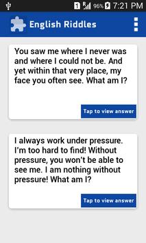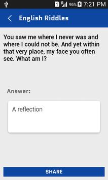 More than 200 riddles in english offline available in this app. While using this app, your creative thinking will be develop. Easy to share the english riddles to facebook, whatsup, twitter and more.