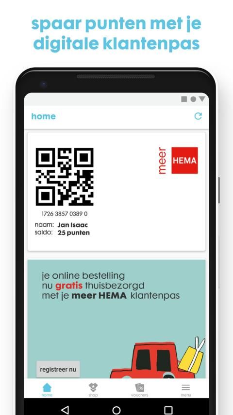 In de HEMA app vind je de leukste klantenpas van Nederland! Met jouw digitale klantenpas spaar je punten bij elke aankoop en deze wissel je in voor leuke kortingen op HEMA producten. In de app kun je op elk moment je puntensaldo inzien en activeer je de 'meer HEMA' aanbiedingen. Ook krijg je van ons een gratis tompouce voor je verjaardag.