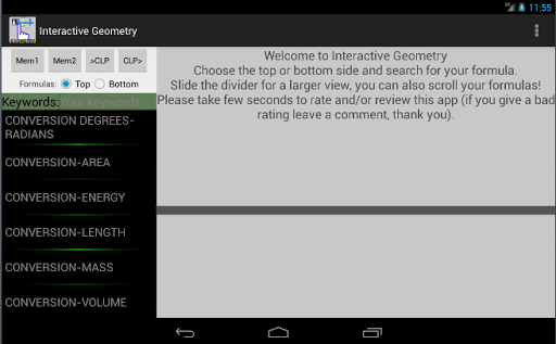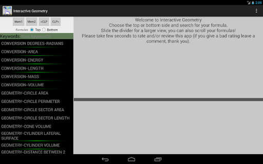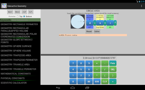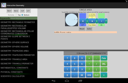 This app is ideal for students and graduates, you will find a variety of useful geometry formulas and you can enter a value by touch, the interactive feature make it easy to avoid typing or human errors.