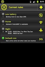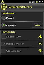 Automatically manages network connections to save power and moneyNever forget to disable or switch your data connection again Use rules to decide what data connection to use. Useful with limited data plan, to save battery or just use best connection at any time.This application allows to switch mobile and wifi connections on or off or even enter automatically in airplane mode based on rules created by user. To create these rules you can use conditions like time, date, location wifi networks available, battery level and more.For example you can create rules like these: Enable 3G only from 8:00 a.m. to 5:00 p.mn Enter airplane mode at 11:00 p.mn Disable 3G if phone is face downn Enable Wifi when you arrive homen Enable Wifi if your wifi network is available n Disable data connection if battery level is under 20n Enable Wifi when phone is pluggedn Enable 3G for 5 minutes every 30 minutes and save batteryn Enter airplane mode automatically while on a calendar event described as quot;meetingquot;This version supports a maximum of two rules with two conditions each one. If you want to be able to create more rules or use more conditions, avoid ads, get an advanced widget, get priority support and help development of this application please purchase Pro version. Note: 3G switch does work only in GSM phones, not in CDMA.Please report problems by mail so we can help you instead of give application a bad score.