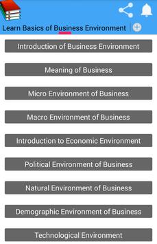 for those students and managers who want to get knowledge of business environment more deeply. If you are students or manager of any company or doing own company based business, you must aware about business environment which is made from social, political, governmental, technical and economic environment. You should know every updates in it. According to external business environment, business needs to update its internal environment. So, this app will be helpful to teach all about these concepts.