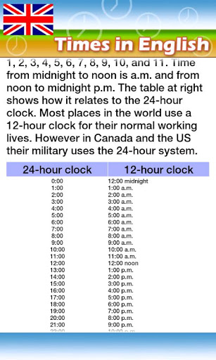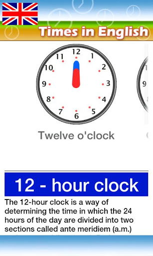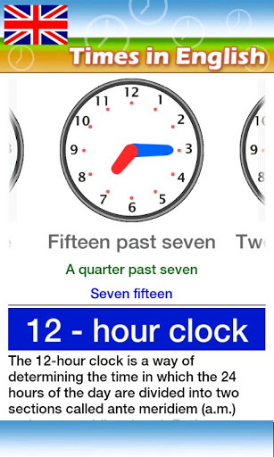 with this App you will improve your english learning how to tell the time.Some clocks are shown and you can check different ways to tell its corresponding time.