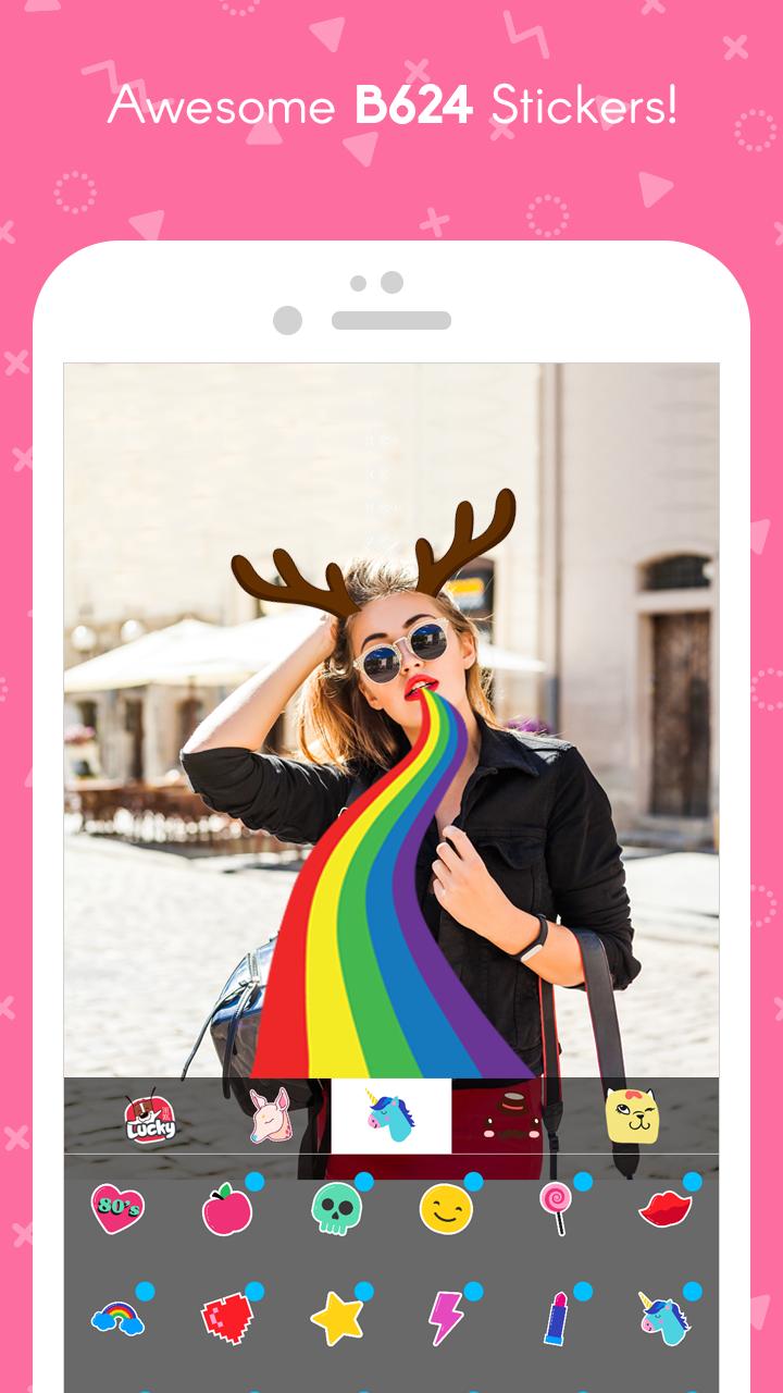 Tons of features available in editing option. New stickers are added from time to time. Cute stickers for your selfies and artistic ones for your classic collection. We have worked with well known photographers and real people just like you to develop this perfect B624 selfie app.