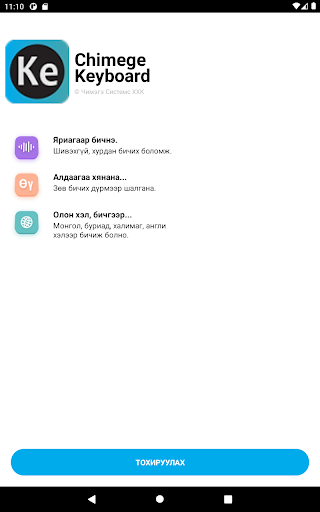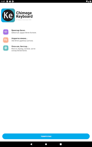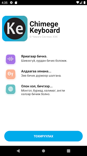 The Chimege keyboard is the first ever Mongolian voice typing keyboard which includes Mongolian spell checker, developed by Chimege Systems LLC. It is totally free.