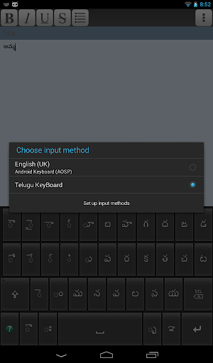 4. Change to Telugu Keyboard by going to "Choose Input Method" -> Select Telugu Keyboard option available on the Notification bar(Drag down/Swipe down Notification bar).
