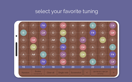 Guitar Notes display every note located on the fret-board. Once a note is selected it is highlighted to make easy to recognize.