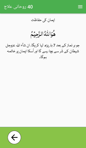 • Deze applicatie bevat ook 40 spirituele behandelingen (Rohani ilaj) van verschillende ziekten en calamiteiten door ASMA-E-ILAHI.