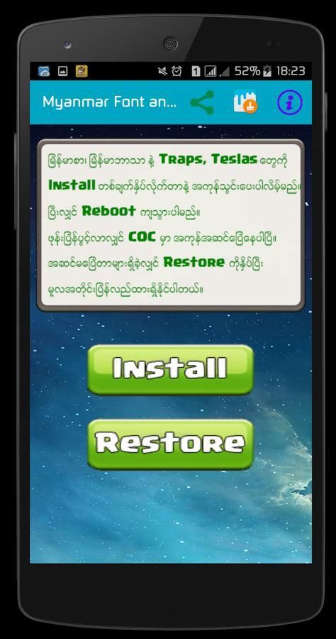 9Apps provide lots of India android apps. 20,000+ users downloaded Myanmar Font and Language 4COC latest version on 9Apps for free every week! Therefore, people are willing to accept this latest version. This hot app was released on 2017-01-11. To read more information, you can go to 9Apps.