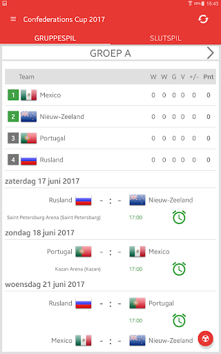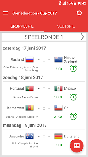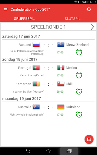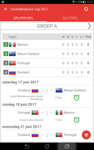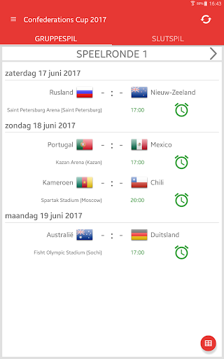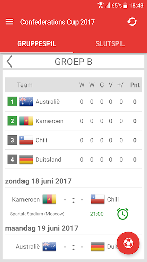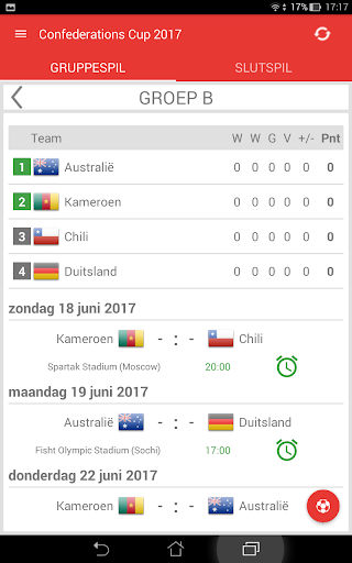 Uitslagen voor Confederations Cup Rusland 2017 is de applicatie waarmee u de wedstrijden van het internationale voetbaltoernooi in Rusland kunt volgen, zelfs als u geen tv of live stream kunt bekijken. De applicatie bevat een schema, een overzicht van alle wedstrijden, een groep tafel, een live tussenstanden en zal zelf bepalen welke teams zullen kwalificeren voor de Slutspil. Met de app mis je geen DOELPUNT of begin van een wedstrijd, omdat het je een notificatie zal sturen. U kunt favoriete wedstrijden selecteren en alleen kennisgevingen ontvangen voor hen. In Confederations Cup 2017 spelen de teams: Rusland, Duitsland, Australië, Chili, Mexico, Nieuw Zeeland, Portugal en Kameroen.