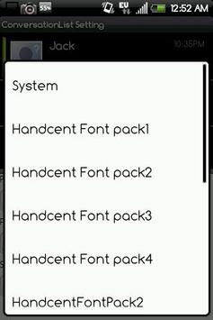 Click "ConversationList Settings" Then Choose "Contact Font",Click "Font Pack" drop down list, And you will see a list,for example: Handcent SMS font pack1,Handcent SMS font pack2,Handcent SMS font pack3,Handcent SMS font pack4,Handcent font pack5...choose one of these packs,if you haven't installed it ,handcent will navigate you to the market and you can install it directly. after you have choosen font pack ,you can choose font at the packs and define the style ,size and so on
