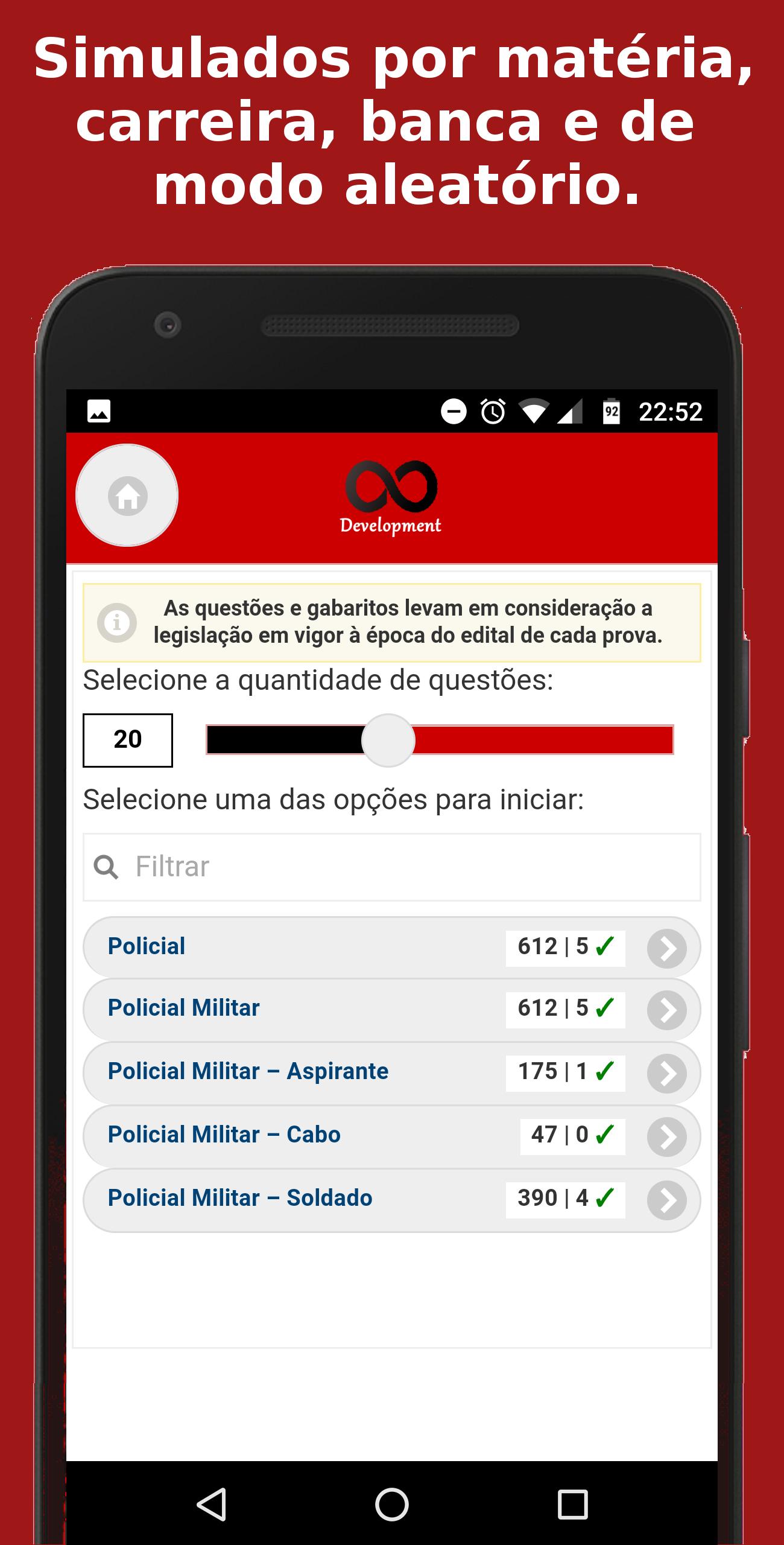 Este aplicativo é para ajudar você nos estudos e preparação para os concursos da Polícia Militar (PM), contendo questões de várias provas realizadas por este órgão e para vários cargos.