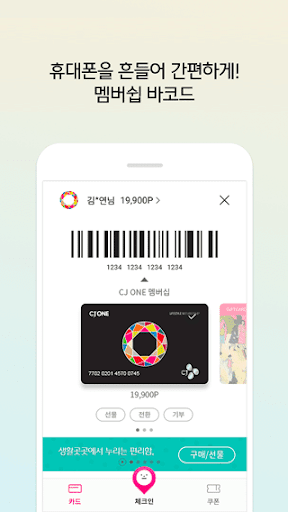 CJ ONE APP CJ One Point Zarabiaj / Użyj i przechowywanie Znajdź, Moja ocena punktowa / Członkostwo, najnowsze wydarzenie marki / kupon, istnieją różne korzyści, takie jak wiadomości.