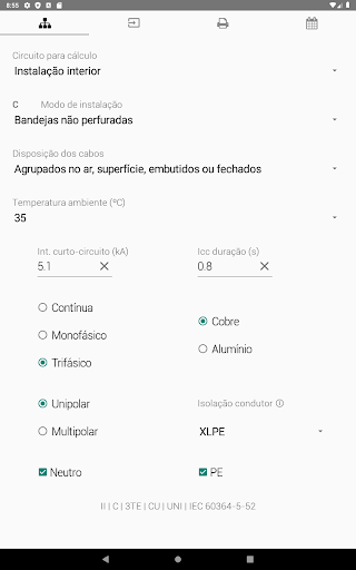 · Condutividade do condutor, dependendo da corrente do circuito (constante, de acordo com a corrente esperada, temperatura máxima do cabo)