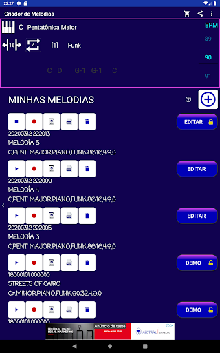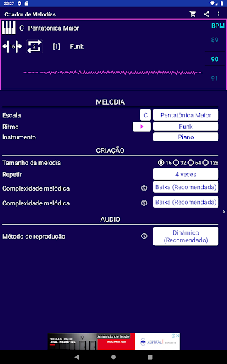Você está procurando inspiração para criar ou compôr a melodia de uma música? Com o toque do botão Criador de Melodias ele cria e reproduz rapidamente melodias originais aleatórias para você usar, compartilhar ou se inspirar. Crie diferentes melodias de forma quase ilimitada com as opções de configuração que o Criador de Melodias tem.