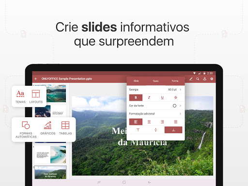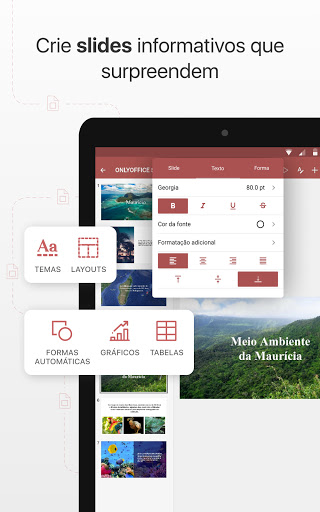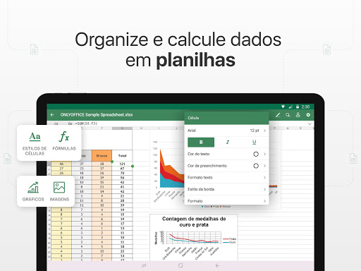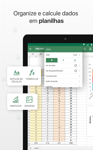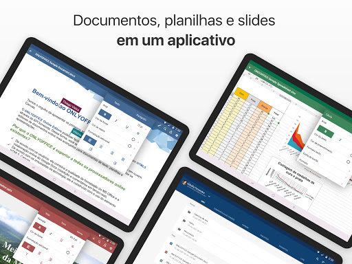 Com o ONLYOFFICE você pode criar e editar documentos de texto, planilhas e apresentações. Os formatos básicos são DOCX, XLSX e PPTX. Todos os outros formatos populares (DOC, XLS, PPT, ODT, ODS, ODP, DOTX) também são suportados.