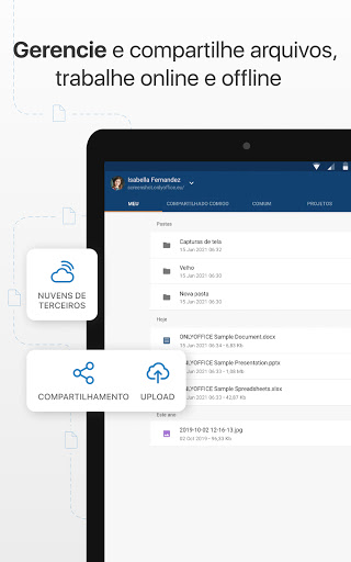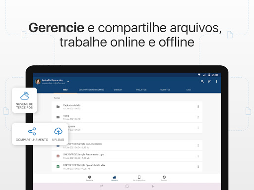Envie e baixe arquivos, organize, filtre, renomeie e apague-os, adicione aos favoritos. Para trabalhar na nuvem você precisará ter um portal, seja um corporativo ou um gratuito para uso pessoal. Se você não tiver um, poderá facilmente criá-lo pelo app.