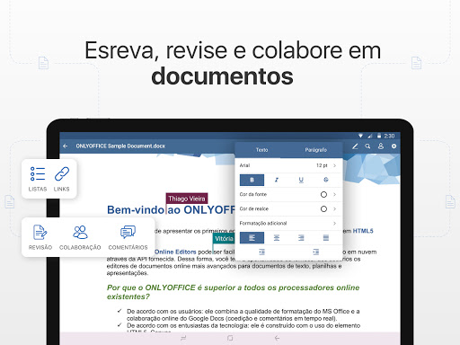 Com o ONLYOFFICE Documents múltiplos usuários podem editar o mesmo documento simultaneamente. Você verá mudanças aparecendo conforme seus colaboradores estão digitando.