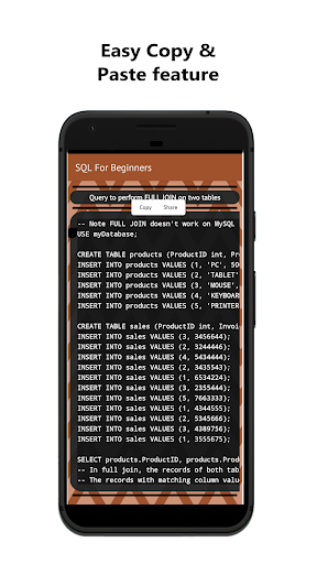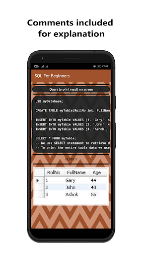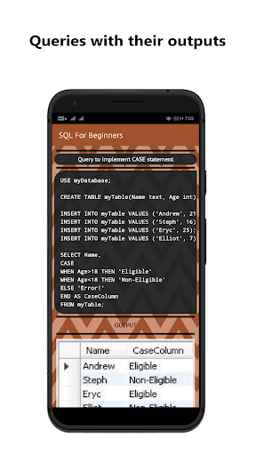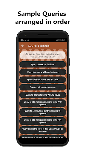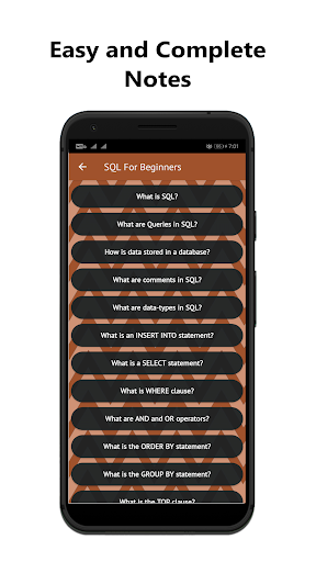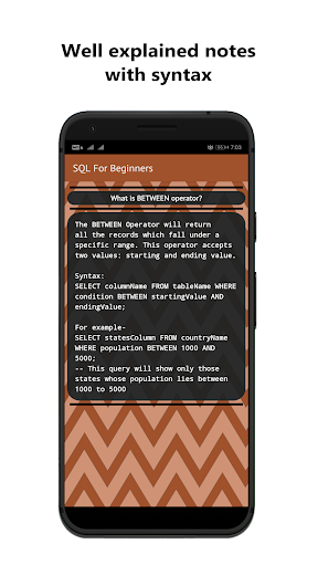 Aprenda o básico para projetar um banco de dados.O aplicativo está bem estruturado com notas de tópico e fáceis de seguir consultas (códigos).O conteúdo do aplicativo foi projetado de maneira passo a passo, para que você possa entender completamente cada conceito.O aplicativo pode ser usado por iniciantes absolutos que não têm experiência no idioma SQL.
