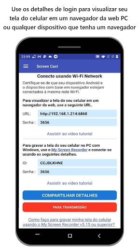 Pode ser necessária uma senha opcional para conexões, que podem ser alteradas a partir das configurações da Aplicação.