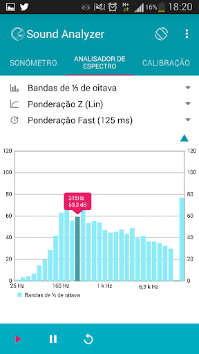 Espectro em bandas de ⅓ de oitava: frequências centrais de 25 Hz a 16 kHz,