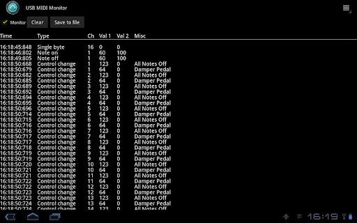 O USB MIDI Monitor permite visualizar todos os eventos MIDI recebidos da sua interface MIDI USB. Os eventos são timestamped e o tipo de evento, o canal MIDI e os valores são exibidos em uma tabela rolável. Para alterações de controle, informações extras são exibidas se a alteração de controle for um tipo conhecido como volume ou panning.