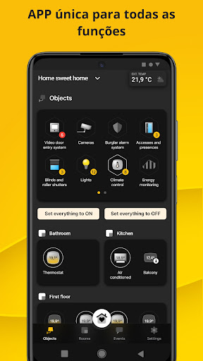 Controle a sua casa conectada, baseada no sistema integrado VIEW IoT smart systems, com uma interface simples e intuitiva: todas as funções da casa inteligente estão ao seu alcance desde o primeiro arranque e em total segurança, depois de inseridas as respetivas credenciais de acesso, geradas no portal Cloud VIMAR. A App não requer nenhuma configuração porque herda a programação já efetuada pelo instalador elétrico profissional com as várias ferramentas de configuração dos vários sistemas instalados no edifício (VIEW Wireless ou By-me Plus, By-alarm, Videoporteiros Elvox, Câmaras Elvox).