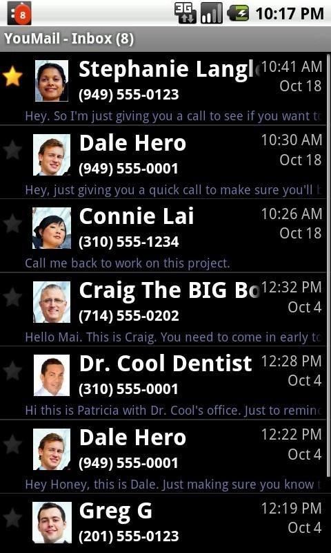 YouMail is handier, faster, and more fun than your iPhone visual voicemail – and free! Scroll and play like before, but on any device: Android phone, Android tablet, computer, or e-mail account. Enjoy visual caller ID, showing caller photos, name, and city and state. Wow callers, automatically greeting them by name. Share important voicemail easily, and save it forever, neatly organized in folders. And, for a small monthly fee, you can save time by simply reading your voicemail within the app or by e-mail, without ever having to listen to it. Most US Carriers supported. Sorry, doesn't work with flex/pre-pay accounts. Requires you to Forward your Unanswered calls to YouMail. Need help? Go to forums.youmail.com Recent changes: * You can now see caller photos in both portrait and landscape mode (prev was only landscape). * Message details will now show the callers City/State if available. * If the callers email address is in your phones contact list, you can now reply via email (prev was just SMS) * You can now Forward or Share a message using any compatible app on your phone (Facebook, Twitter, etc)