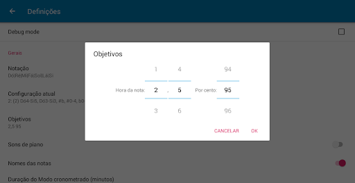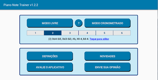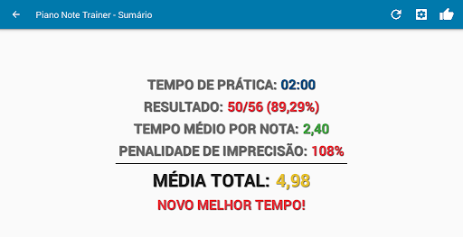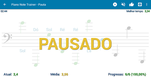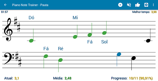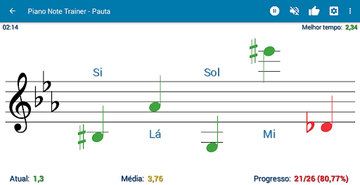 ✔ Modo prática e Modo Cronometrado. Cada configuração (intervalo de notas, acidentes, armação de clave, duração) tem seu próprio melhor tempo. Se você alcança um melhor tempo e então troca para uma configuração diferente (ex. adicionando sustenidos), passará aver o melhor tempo desta configuração.