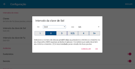 ✔ Intervalo de notas configurável. Pode ser TODO seu teclado (A0-C8, La0-Do8).