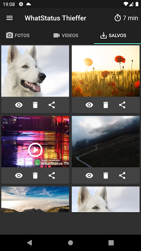 Para ver todos os status salvos no seu celular, abra o WhatStatus Thieffer e clique na aba de "SALVOS" e lá você pode compartilhar o status com seus amigos em qualquer rede social ou postar novamente no seu WhatsApp Mensageiro/Business.