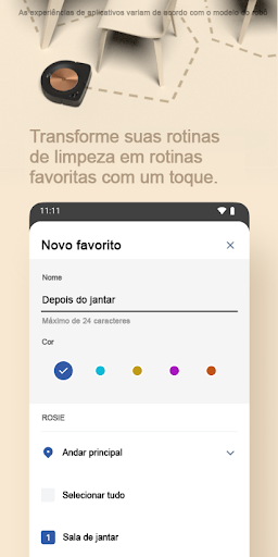 Obtenha uma experiência de limpeza criada só para você. Crie programações de limpeza, salve favoritos e ajuste-os rapidamente. Obtenha recomendações de limpeza personalizadas com base no que está acontecendo em sua casa e até peça aos seus robôs para limparem enquanto você estiver fora de casa com a integração de casa inteligente. A limpeza deixa de ser algo que você precisa fazer e torna-se algo que simplesmente acontece na sua vida.