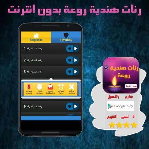 تطبيق بدون نت يحتوي على مجموعة من أروع النغمات الهندية المشهورة بجودة عالية يمكنك إستخدامها على شكل رنات للهاتف أو على شكل منبه كما بمكنك تحميل ومشاركة النغمات الهندية مع