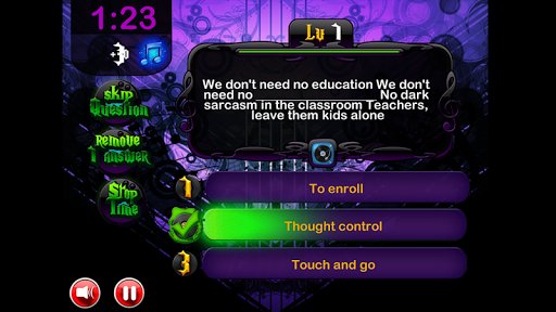Você ouve o refrão de uma música e lê parte desse refrão, junto com opções para completar o que falta. Seu desafio é escolher a alternativa que completa o refrão de acordo com o que você está ouvindo. Se você completar o refrão corretamente, pode ganhar um bônus se acertar também qual é o nome da música e da banda. Quando não souber a resposta, pode usar os recursos de ajuda: 'Parar o tempo', 'eliminar alternativa' e 'pular música'. Faça o máximo de pontos que puder, completando o maior número de refrãos dentro do tempo que você tem! Esse é um jogo didático para você aprender a cantar algumas das músicas mais famosas.