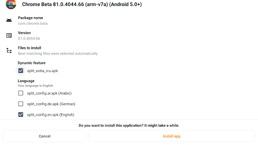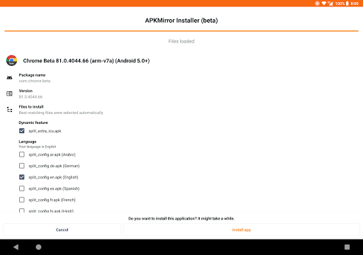 Each .apkm file is comprised of a base APK and a number of split APKs. Once you've installed APK Mirror Installer and downloaded the .apkm file you'd like to install, simply tap on it or use APKMirror Installer to find the download location. You will be able to see the exact contents of each .apkm file and select only the splits you want to install to save space on your device.