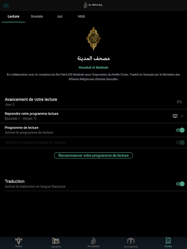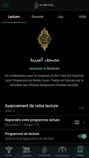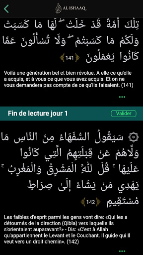 Curan по-арабски и переводе чувства стихов на французском (Moushaf Al Madinah). Комплексная программа обучения для чтения Корана завершить его в 15 или 30 дней. Бренд был введен для сопровождения наблюдения нашего ежедневного чтения. Можно прочитать Коран на приложении без подключения к Интернету.