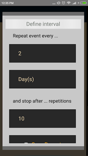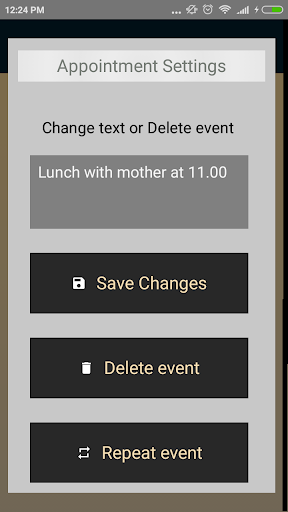Вы можете открыть диалог настроек, просто наступив на встречу. Текстовое поле отображает текущее назначение, и вы можете редактировать и сохранить текст или исключить запись полностью. Другие доступные варианты повторяют событие (например, каждые 7 дней), устанавливайте уведомления, чтобы показать каждую минуту, час или день и очистить всю базу данных всех встреч (например, новое начало).