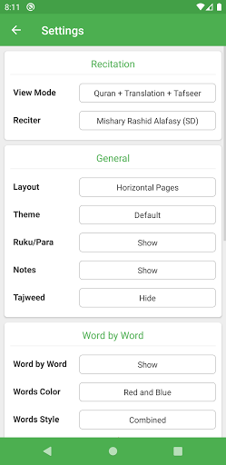 - Возможность показать / скрыть слово по Word, Quran Transly (Tarjuma) и Tafseer