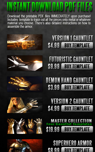 Each tutorial is accompanied by a template you can purchase from inside the app. Download the printable PDF files IMMEDIATELY upon purchase! Download includes the template to trace out all the pieces onto metal, foam, plastic, or whatever material you choose for your costume, cosplay, or display piece! There are also detailed instructions on how to assemble the armor. Whether you are building a medieval suit of armor, or a superhero uniform, this app is right for you!