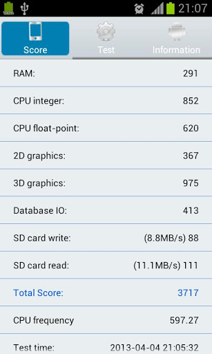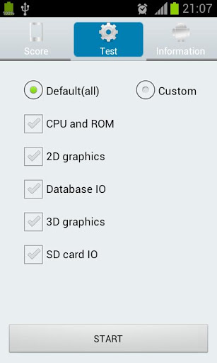Benchmark is Android Benchmarking tool.Main test items:CPU and ROM tests2d graphics test3d graphics testDatabase IO testSD card IO testAfter testing the app will show you the detailed performance scores including: RAM, CPU integer, CPU float-point and etc.