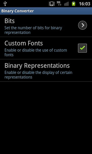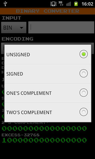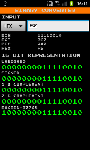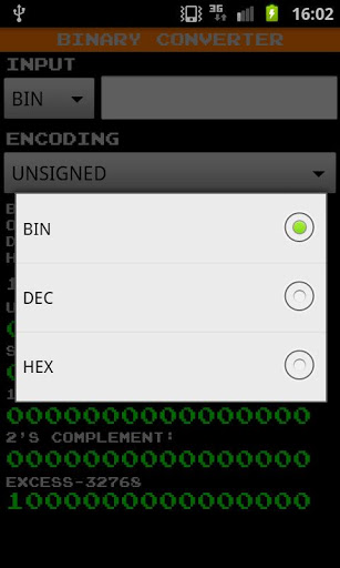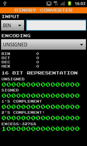 Simple Binary Converter and Base Converter.Supports BINOCTDECHEXInput a binary number and choose your encoding signed, unsigned, one39;s complement, two39;s complement or input a decimal or hexadecimal number and it will calculate for you the:Binary Value Base 2 Octal Value Base 8Decimal Value Base 10 Hexadecimal Value Base 16NBit Binary Representation for:UnsignedSignedOne39;s ComplementTwo39;s ComplementExcessK Offset binaryYou can change the number of bits used in the settings default is 16 bits.The number is out of range or cannot be represented e.g negative number and unsigned the text will change to red. Green text means that the number is represented correctly.If the number is outside the range i.e too large to represent with Nbits it will truncate it.Useful for students. If you want features or have problems contact email below. 5 ratings are always appreciated this app is advert free and something I just made for funTO DO:I39;ll be adding a AND,OR,NAND,NOR,XOR,XNOR binary logic calculator soon.