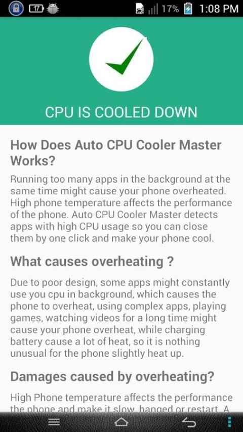 Запуск слишком много приложений в фоновом режиме в то же время может привести к перегреву устройство. Высокая температура телефона влияет на производительность телефона. Auto CPU Cooler Master обнаруживает приложения с использованием высокой CPU и закрывает их, чтобы сделать ваш телефон прохладно.