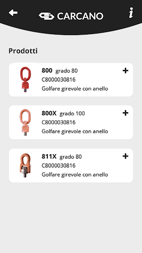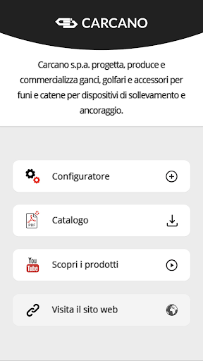 The CARTEC App of Carcano s.p.a. integrates a powerful product configuration tool that guides the user in choosing the right CARTEC lifting and anchorage device. The App is configured as a unique and essential tool that suggests the right CARTEC products according to your own technical needs, in terms of lifting method with one or more legs, or based on the load to be lifted.