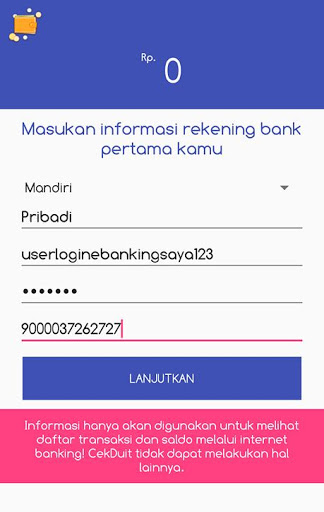 Jika tidak percaya dengan keamanan data kamu?, kamu bisa membeli source code nya : tanpa iklan, rekening yang bisa cek hanya BCA BNI Mandiri, dengan menghubungi info@sellerkeys.com . Dimana kamu bisa melihat source code lengkap, tidak boleh di distribusikan lagi. Kamu harus mengerti dan berpengalaman dalam mem-build source code untuk di install di android phone kamu sendiri.