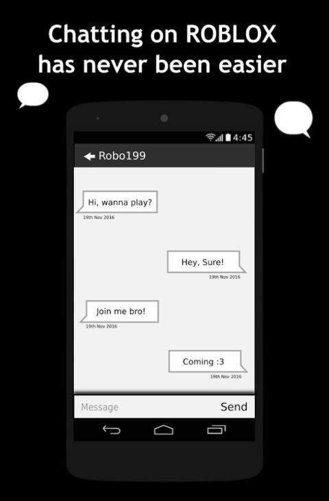 Общайтесь со своими друзьями Roblox и говорить о том, что вы хотите сказать! Это, наконец, можно прямо с вашего андроид устройства для других пользователей Roblox. Roblox представляет собой сеть с небольшим количеством мини-игр, которые работают на Roblox Engine. Она очень популярна и более 100 миллионов человек уже на Roblox зарегистрированных.