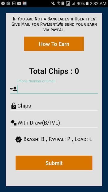 If you earn 100K chips then Go to Cashout Option & Chose Phone no or Email address for requesting your payment.Cashout Payment available Only 5,6,7 date of every month.So Hurry and Earn Some Extra Chips.
