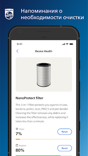 Air отслеживает состояние компонентов устройства Air и обеспечивает его максимальную производительность, оповещая вас о необходимости их очистки или замены. Вы будете получать сообщения и оповещения об обслуживании — в Air вы найдете полезные пошаговые инструкции. Также в приложении в большинстве регионов можно оформить заказ новых фильтров.