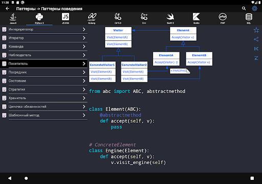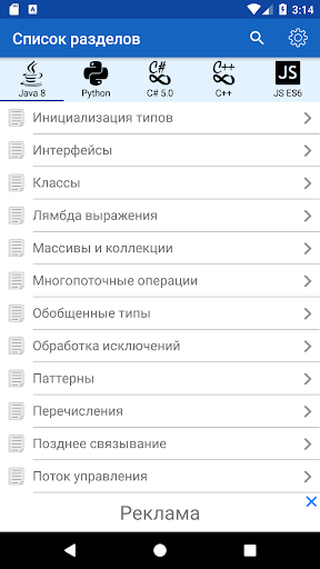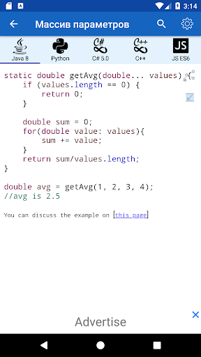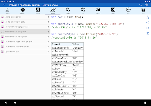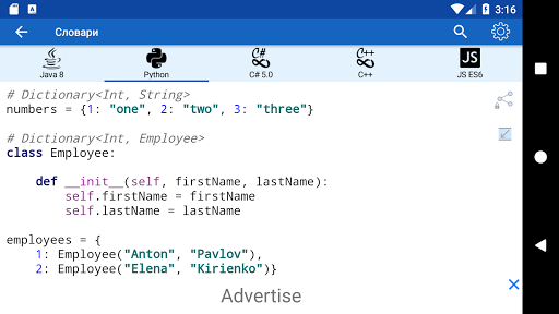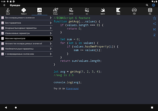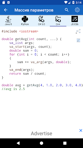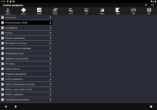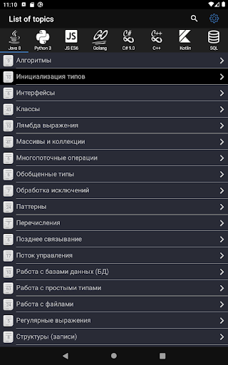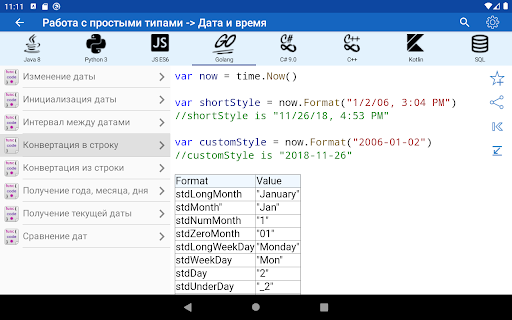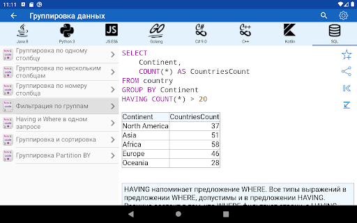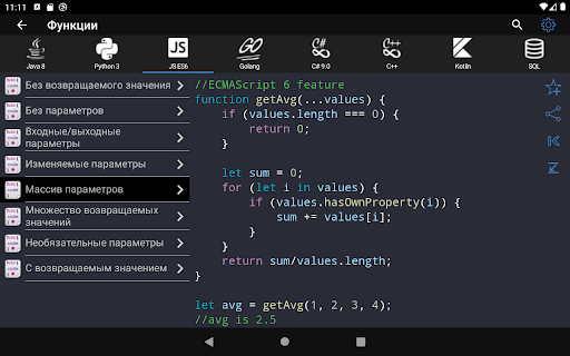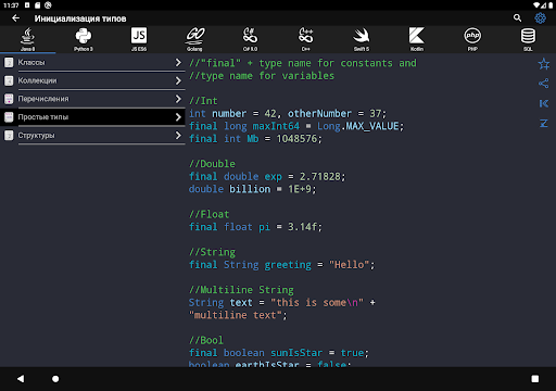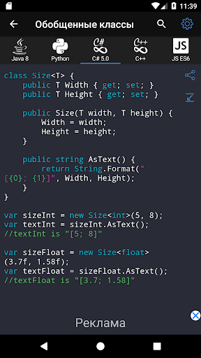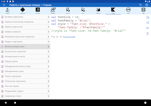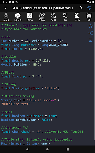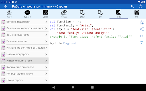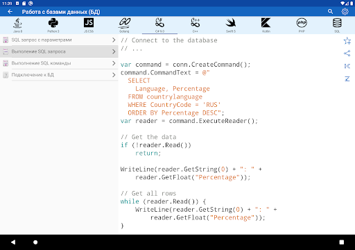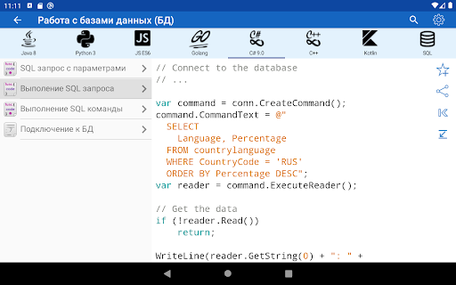 ✓ Изучение синтаксиса языка на конкретных примерах кода. Как получить подстроку? Как объявить обобщенный метод? Как реализовать паттерн "Стратегия"? В приложении доступны эти и еще более 250 примеров кода по каждому языку.