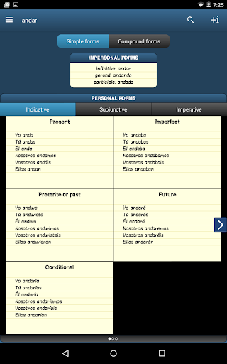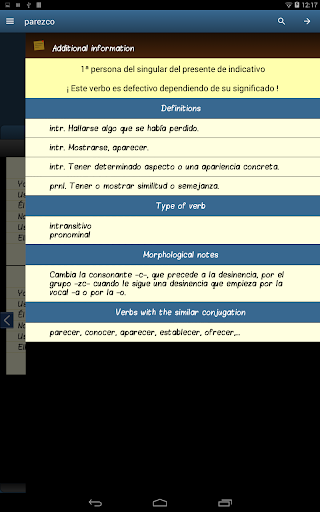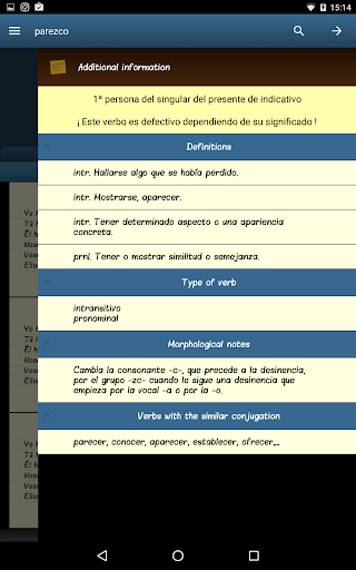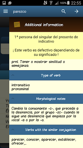 A right tab shows additional information of each verb: verb type, irregularities, notes morphological, orthographical notes, use notes and other verbs that are conjugated as.