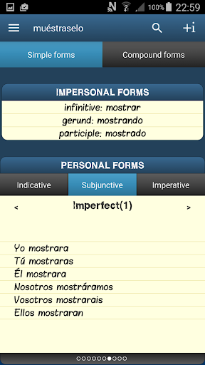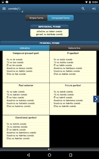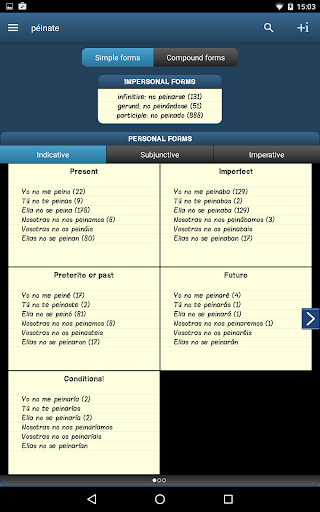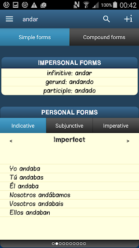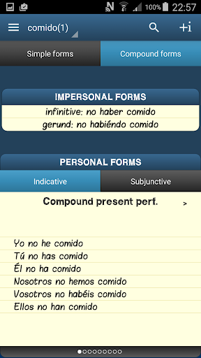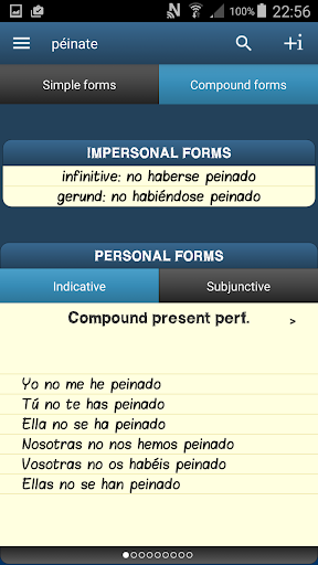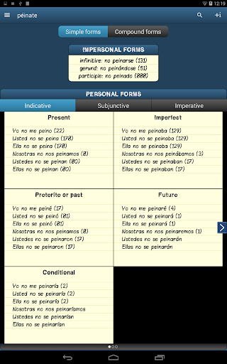 Conjugador TIP of the Spanish verbs presents separately the conjugation of negative forms, pronominal conjugation and conjugation with the female subject, in order to make easier the information showing.